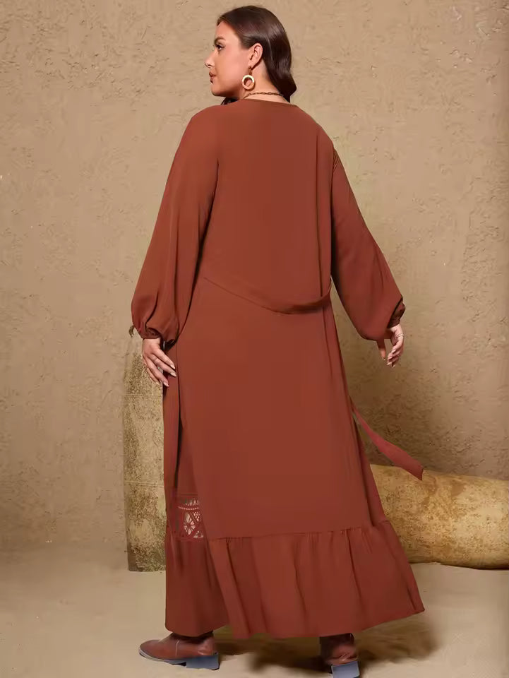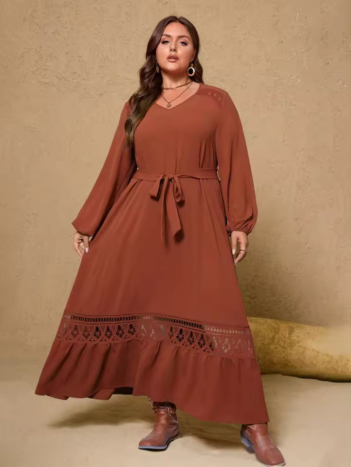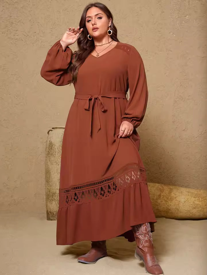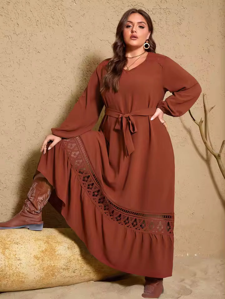 Cette robe grande taille 2025 combine style, confort et sophistication. Conçue pour sublimer chaque morphologie, elle présente un col en V flatteur, une coupe fluide et des détails en dentelle qui ajoutent une touche de charme intemporel.