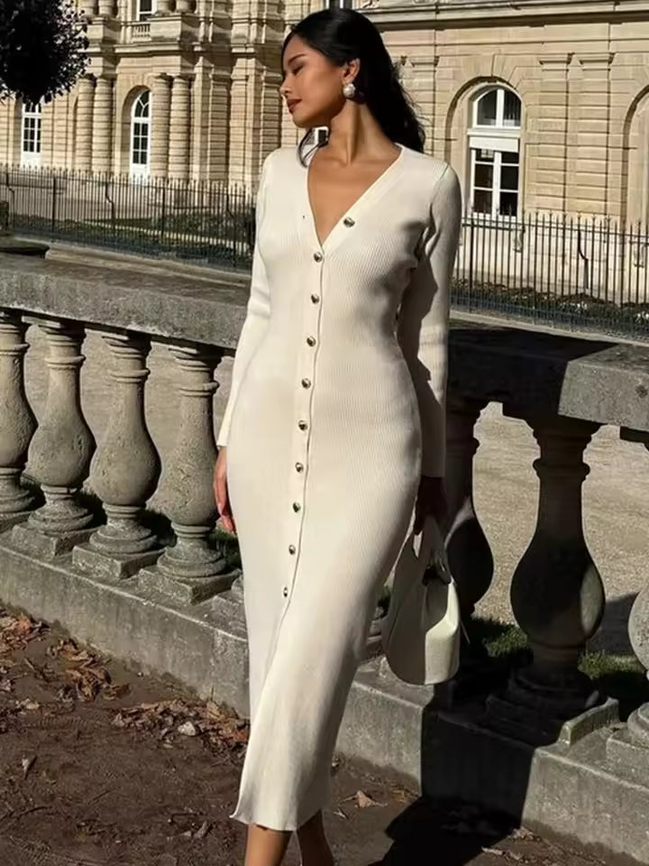 Les boutons décoratifs sur le devant apportent un charme moderne et tendance. Ils soulignent la silhouette et renforcent l’aspect haut de gamme de la robe.