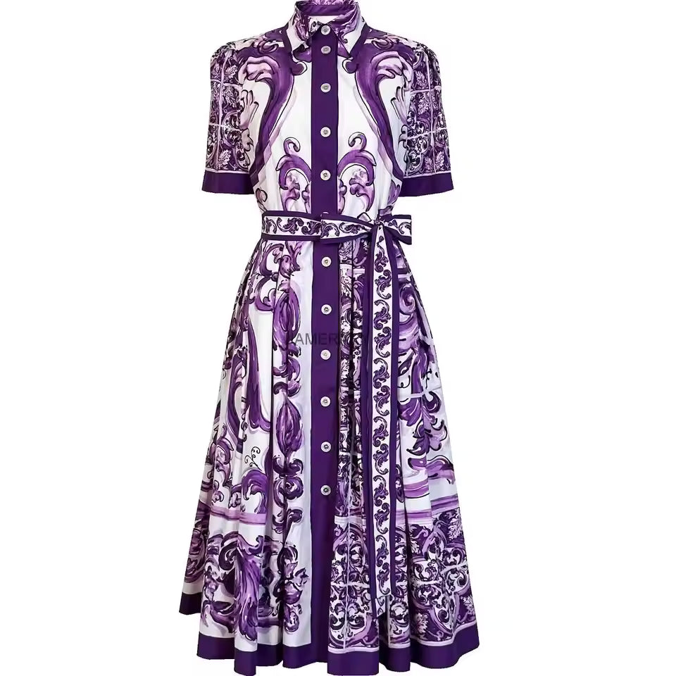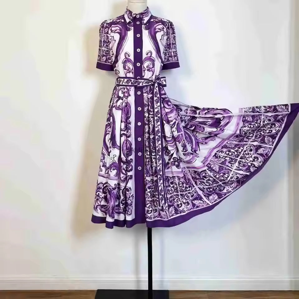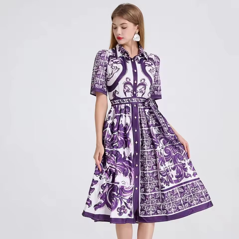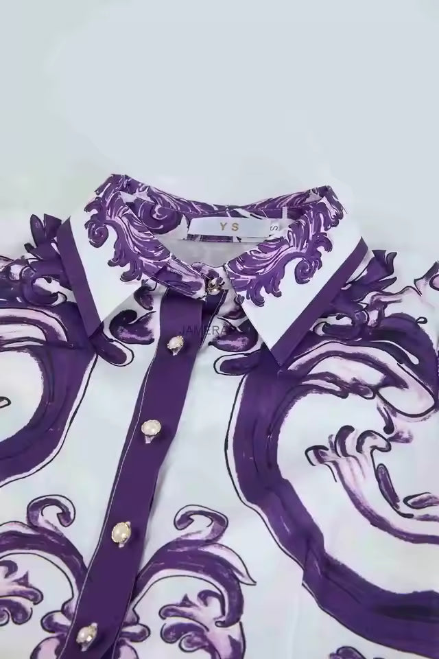 L’imprimé inspiré des motifs porcelaine apporte une touche artistique unique. Les nuances violettes subliment la silhouette tout en donnant un charme délicat et intemporel.