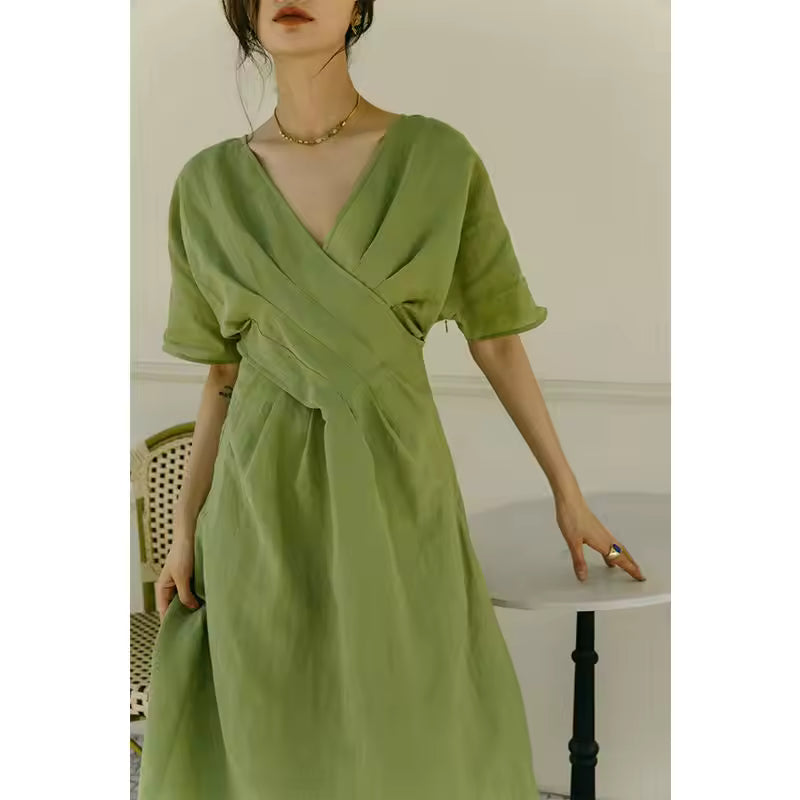 Les plis délicats ajoutent du mouvement et structurent la tenue avec finesse. La coupe midi allonge visuellement la silhouette, créant un rendu élégant et intemporel.