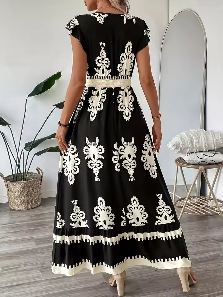 Cette robe longue grande taille offre une allure chic et moderne, parfaite pour les sorties décontractées comme pour les moments élégants. Avec son encolure en V flatteuse et son motif géométrique tendance, elle combine style et confort au quotidien.