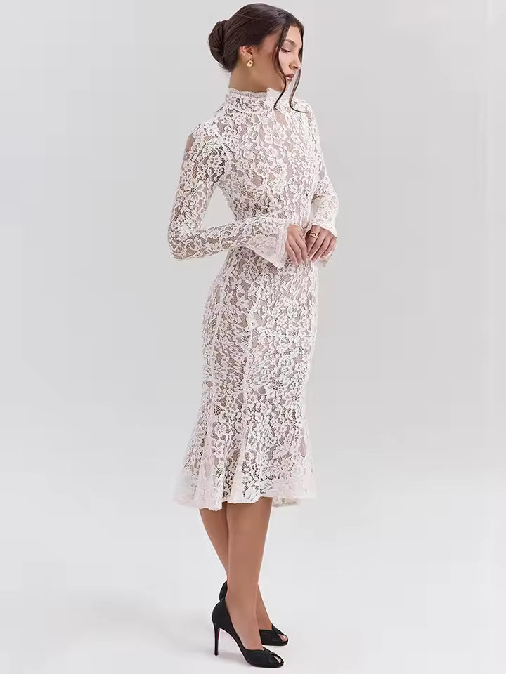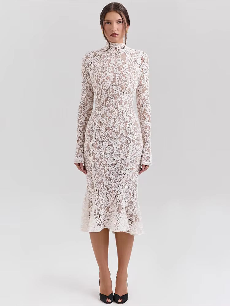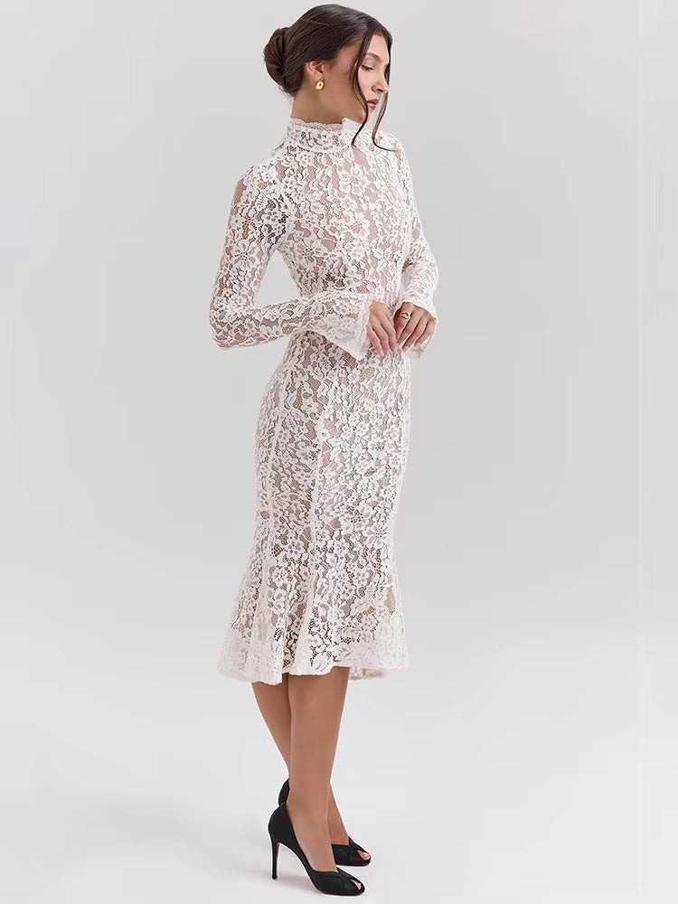 Les manches longues en dentelle transparente offrent un équilibre subtil entre sensualité et élégance. La dentelle apporte une touche romantique tandis que la structure de la robe souligne les courbes sans compromettre le confort.